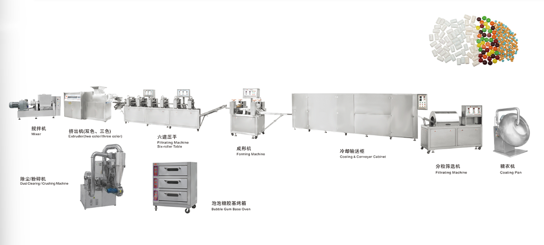The candy extruder is suitable for a variety of products such as bubble and chewing gum, caramel, toffee, milk candy and Swiss candy.
