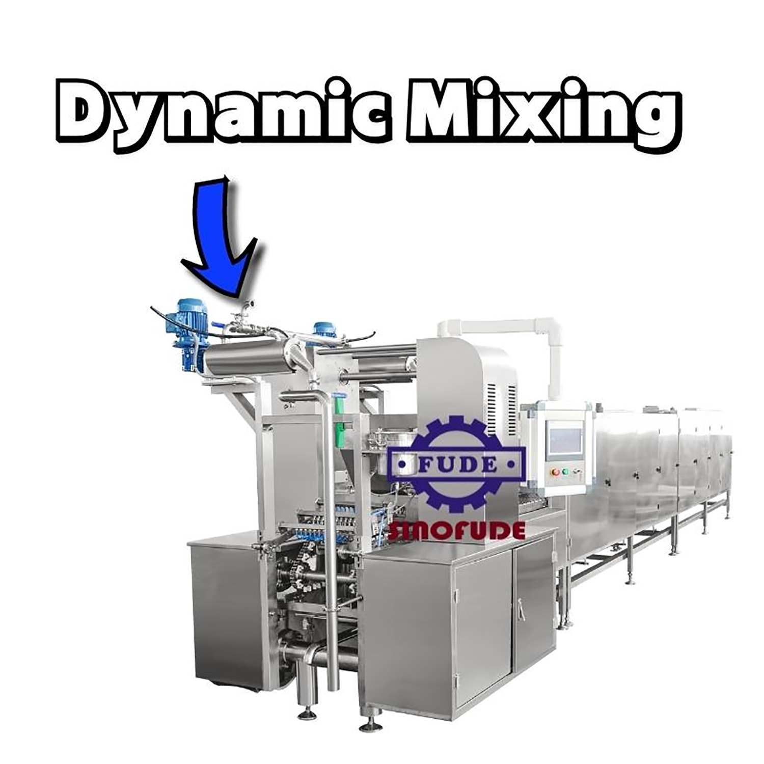 Сағызды кәмпит өндірісінің статикалық араластыру жүйесі басқа өндірушілерден 90 градус бұрышта ерекшеленеді. Біз гмми кәмпит ингредиенттерін 45 градус бұрышпен енгіземіз, осылайша сағызды кәмпит ингредиенттері мен сағызды кәмпит сиропы біркелкі және тұрақты араласуы мүмкін. Сағызды кәмпиттер динамикалық араластыру: әдетте қолданылатын плунжер түріндегі сандық сорғы.