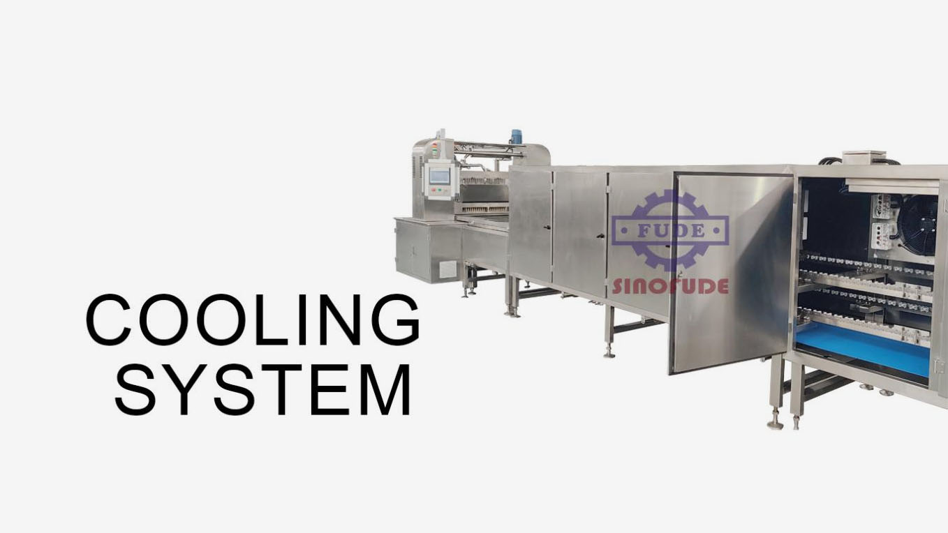 2 қабатты салқындатумен жабдықталған, ауаны қайта өңдеу жүйесімен және тот баспайтын болаттан жасалған қаптамамен бөлінген пішінді тасымалдау жүйесімен жабдықталған, кәмпит бетіне шаң түсуіне жол бермейді. Суық ауа салқындатудың 2 ұшымен кәмпит тасымалдау жүйесіне өтеді. туннель. Салқындатқыш туннельдің артқы жағындағы 2 бағыттаушы рельс тізбекті қорғайтын және қызмет ету мерзімін ұзартатын автоматты керме құрылғысымен жабдықталған. Резервуар тізбегін құйып алу және щеткасы бар қалыптау құрылғысы.