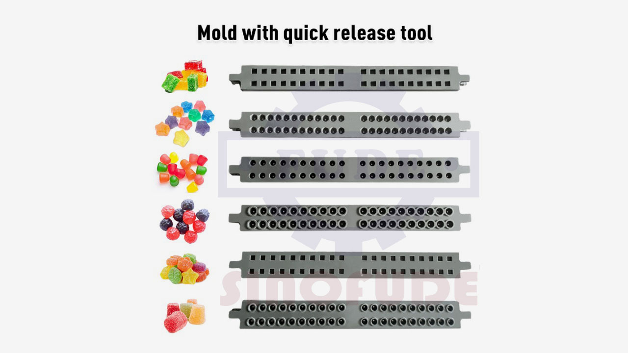 SINOFUDE CBD немесе THC немесе витаминдер мен минералдар қосылған гумми кәмпиттеріне арналған санитарлық және оңай жууға арналған құрылымы бар машина дизайнын мақтан тұтады. Функционалды өнімдер және т.б. Бұл жұмыс күші мен кеңістікті үнемдей отырып, сапалы гуммилерді шығара алатын тамаша жабдық. Shanghai Fuda жұмсақ кәмпиттер машиналары әртүрлі пішіндер мен дәмдегі сағыз кәмпиттерін жасай алады және әртүрлі қалыптарды теңшеуге болады. Тұтас жұмсақ кәмпит өндіру желісінің конфигурациясын, ұзындығын, биіктігін және т.б., сондай-ақ тапсырыс берушінің қажеттіліктеріне және зауыт өлшеміне сәйкес жобалануы мүмкін.