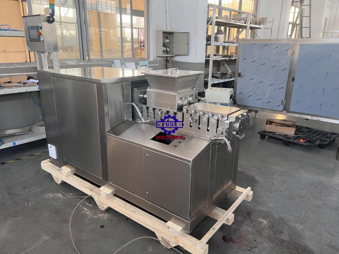 The machine is mainly used for making fondant masses, it is simple to use fondant-beating machine. Sugar, glucose, water is dissolved then put into the hopper of the fondant beater. The beater is turned on and the cooked syrup is fed into the creaming screw. The sugar syrup is then agitated in a controlled way to seed the syrup into a fine fondant paste. The machine has a capacity of 50~500kg per hour and is ideal for a entry level machine. The unit has heated hopper and a jacketed barrel for cooling.