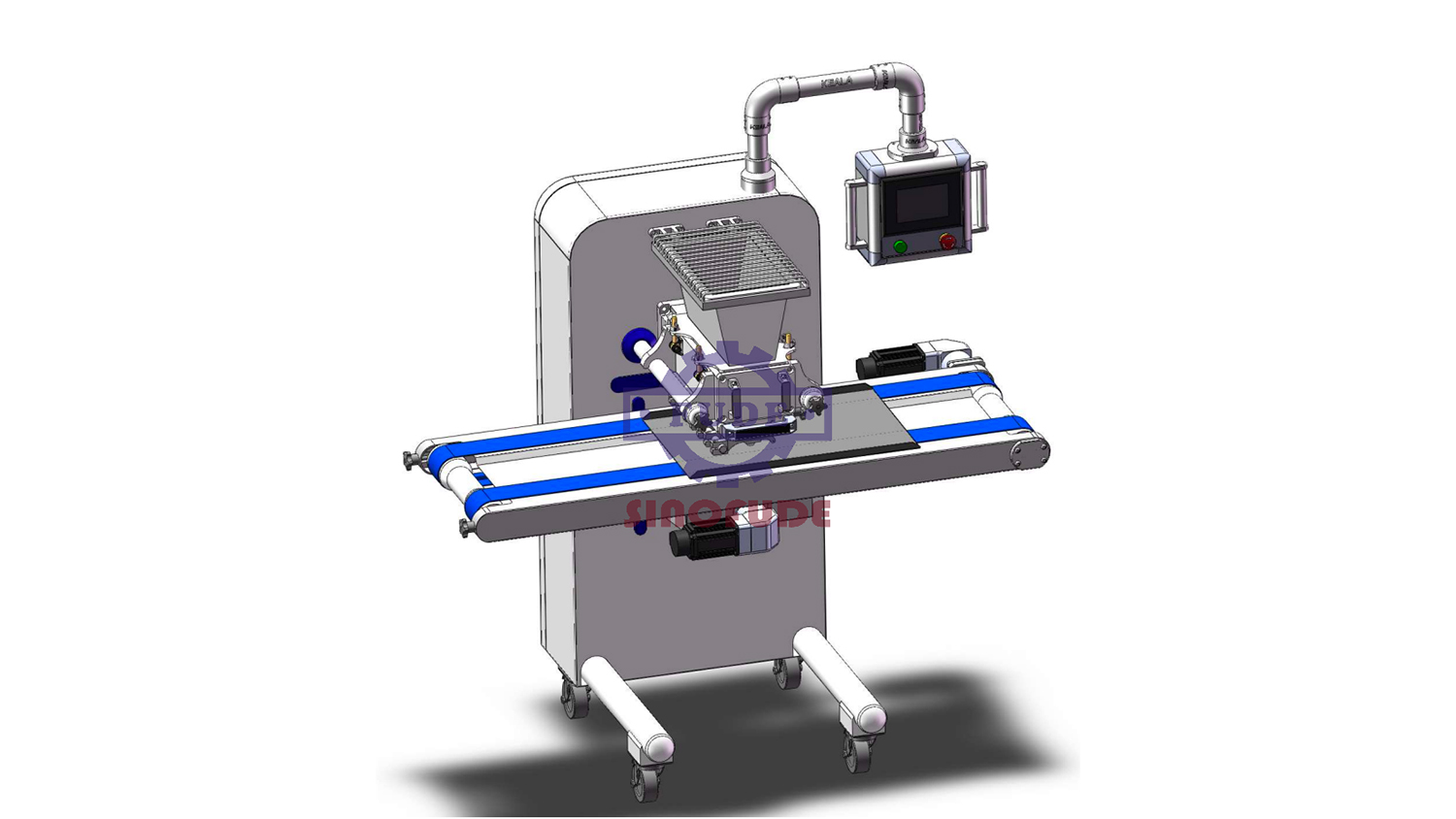 The cookie machine produced by the cookie machine is composed of a stainless steel frame, a servo motor power system, a tray canvas transmission system, a tray up and down lifting system, a feeding roller cookies mechanism, and a wire cutting system. All power parts of the cookie machine are servo motors, equipped with high-quality reducers, photoelectric control systems with high agility performance, and human-machine interface touch-screen operating systems. The production speed and product shape can be set according to actual needs. Put the prepared fabric into the hopper, feed through the feeding roller and rotate and extrude the forming die to become the cookie blank. The tray is placed on the conveyor belt with lifting function. The cookie machine conveyor belt can realize the movement of various technical parameters, use and operation. , maintenance is very convenient.