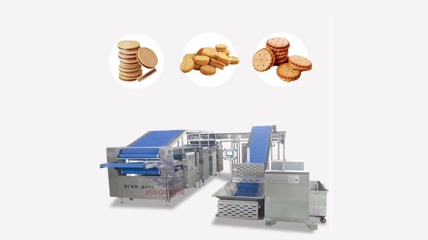 Biscuit can be grouped into hard biscuit、soft biscuit、 cookie biscuit, according to the formula, process, and different forming method.Hard biscuit production line is generally composed of a feeding machine (if producing the soda biscuit or chocolate coated biscuit, another lamination process is needed a set of biscuit dough roller, through the dough rolling and dough sheeting, then through the roller cutting biscuit forming machine, rest material recycling device, inlet oven machine of biscuit production line, the entire biscuit forming line. -or soft biscuit production line and cookie biscuit production line.only the biscuit forming machine and inlet biscuit oven machine can be the whole biscuit forming process.