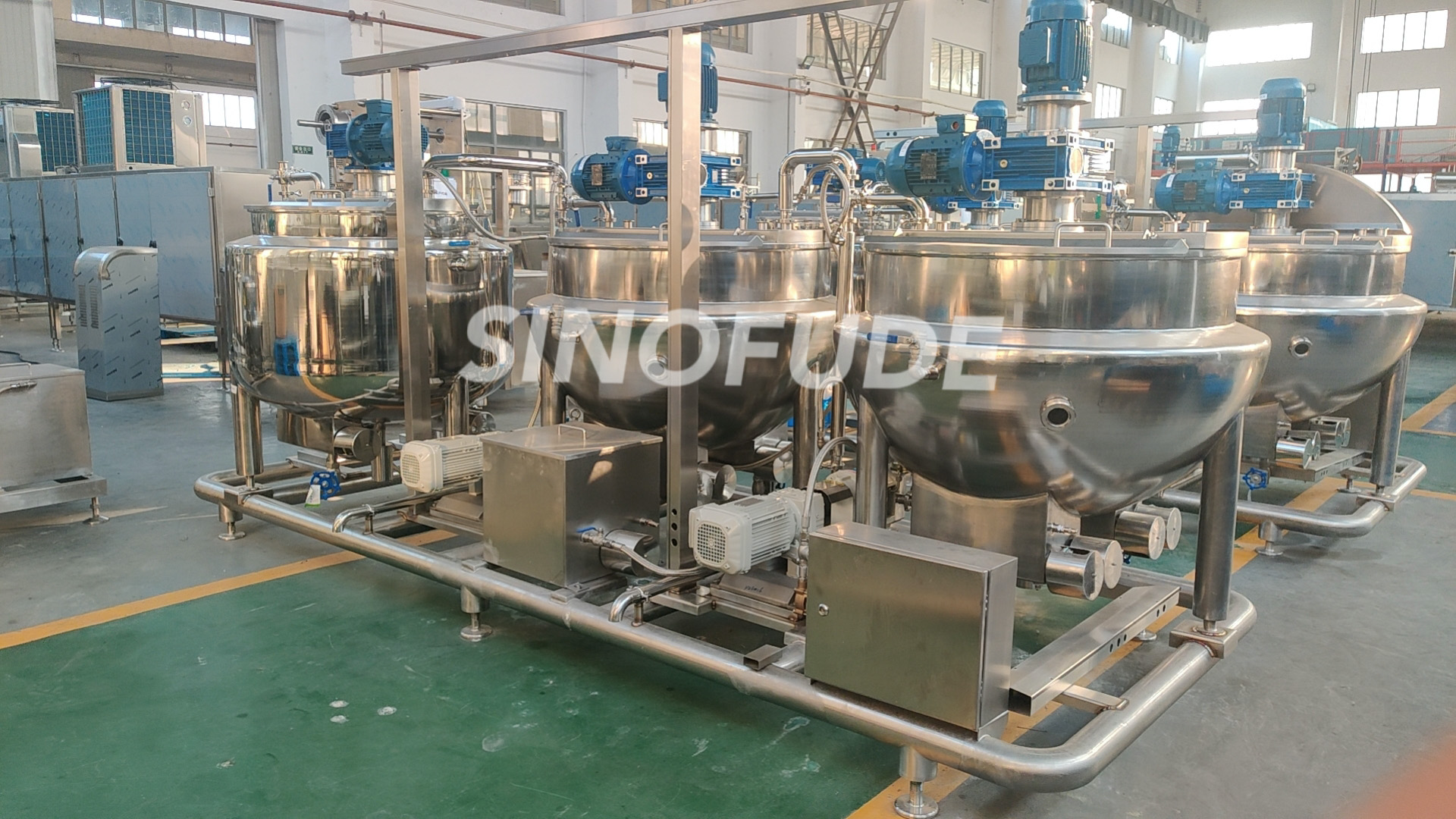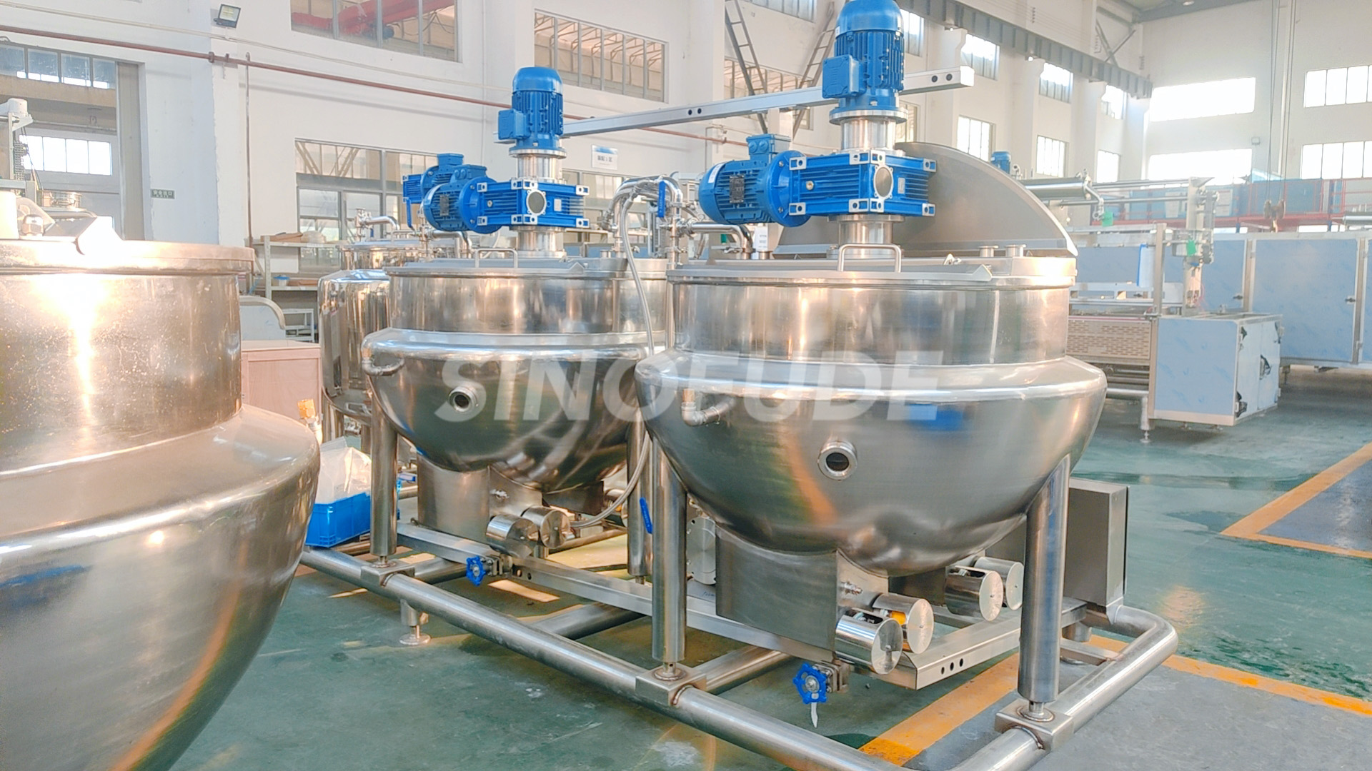 This Jacket kettle machine is widely applied in various gummy candy sugar syrup, hard candy cooking jacket pots, marshmallow cooking kettle, and popping boba syrup cooking.