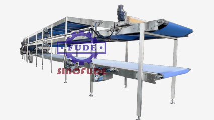 This conveyor is used for cooling down the biscuits after baking to enable the products complete cool down for arranging and packaging. The design of this cooling conveyor may be varied subject to the different requirements and site environment.