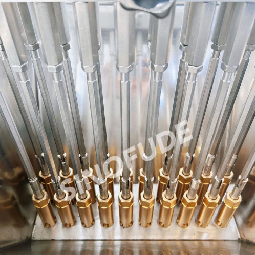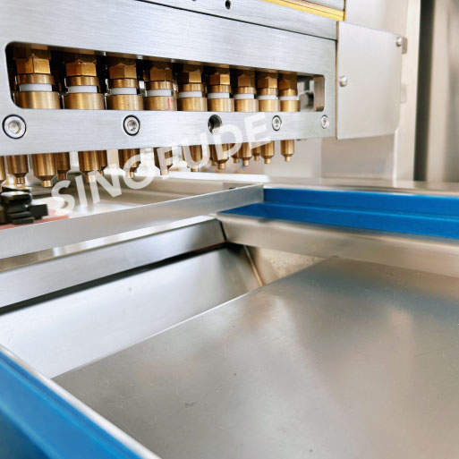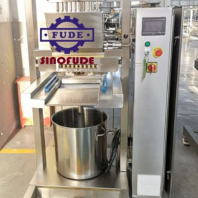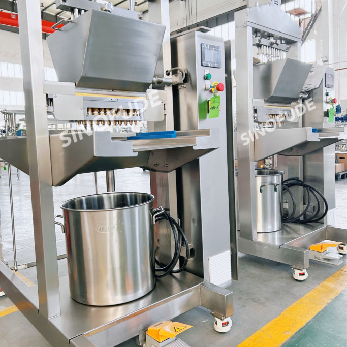 Esta é uma máquina de depósito de balas de goma semiautomática, que pode depositar diferentes tipos de formatos de doces. Coloque o molde no funil de deposição manualmente e, em seguida, abra o botão de deposição, depositando, após a infusão do xarope nos moldes, retire o molde, resfriando naturalmente.