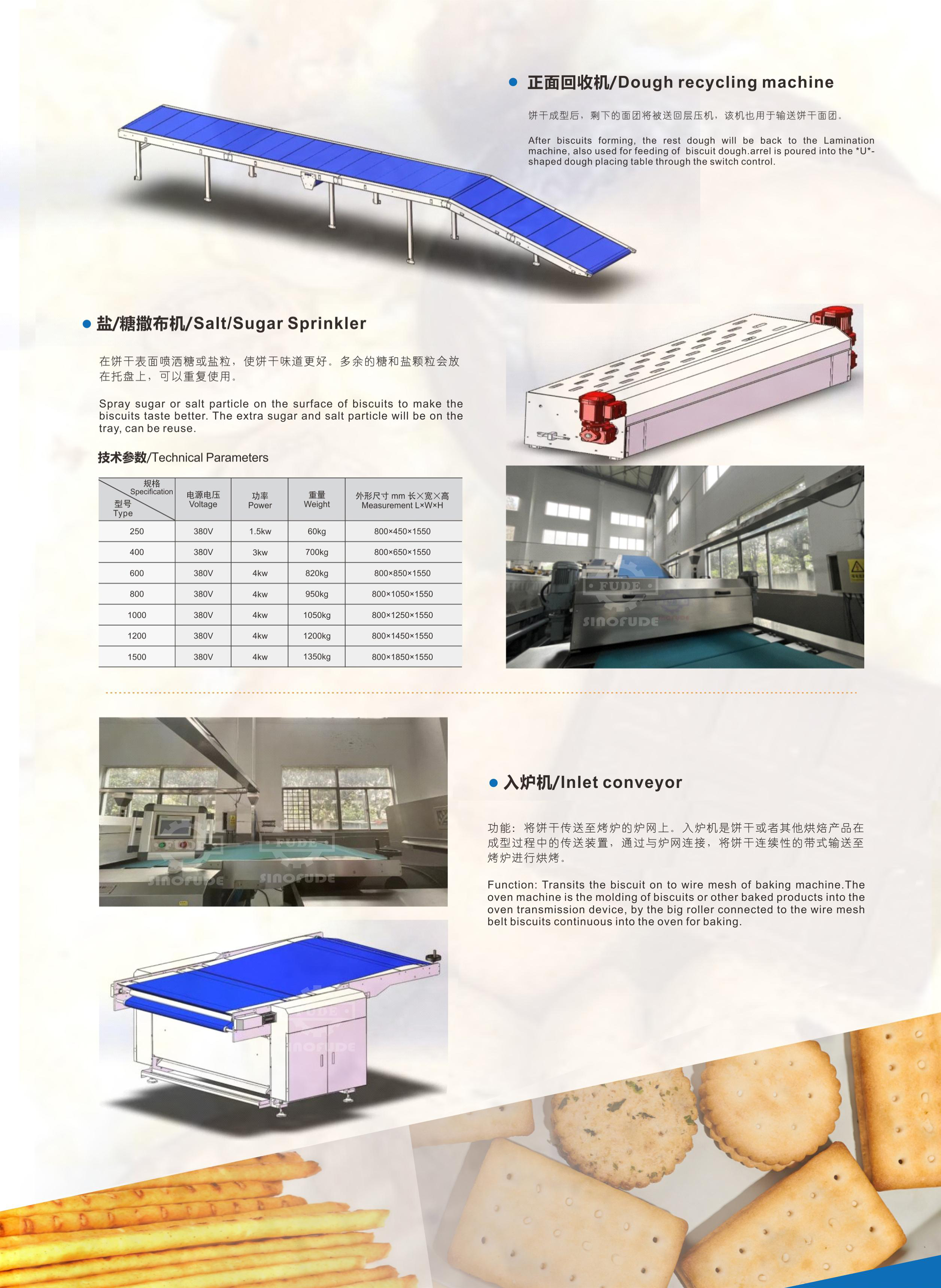 · Sugar / salt sprinkler (optional) – A sprinkler unit can evenly apply sugar, salt or seeds to the surface of biscuits. Sprinkling volume and coverage are adjustable to match different recipes and market preferences.
