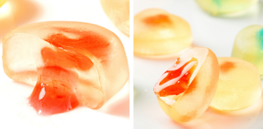 Labẹ awọ-ara ti ita gbangba-gara, omi ṣuga oyinbo ti o kun jẹ han kedere. Nigbati o ba jẹ jẹjẹra, awọ ara ita jẹ rirọ ati rirọ, ati kikun ti nwaye