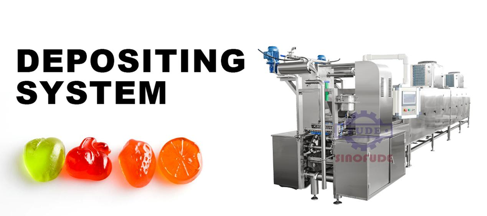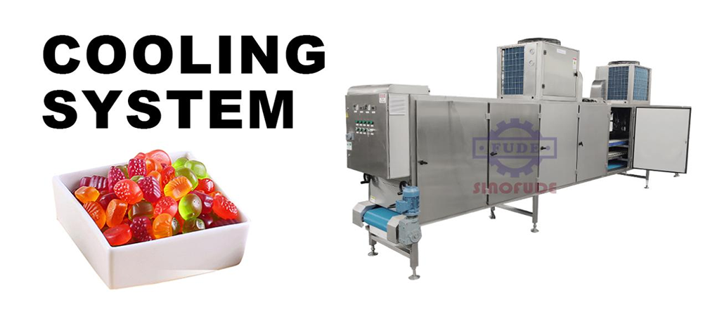 Igbesẹ keji ṣe pataki pupọ. Ti igbesẹ yii ko ba ṣe daradara, jelly eso yoo kuna. Lẹhin ti omi ṣuga oyinbo ti wa ni sise, fifa omi ṣuga oyinbo ti o wa ni laini iṣelọpọ suwiti SINOFUDE yoo gbe omi ṣuga oyinbo ti a fi omi ṣan si suwiti gummy pouring hopper. Awọn hopper ti o da silẹ ti suwiti ti o ni nkan ti pin si awọn ẹya meji, apakan kan tọju omi ṣuga oyinbo ikarahun ti suwiti ti a fi sinu, ati apakan miiran tọju awọn ohun elo aise ti jam ti a fi panu, ati lẹhinna lo eto iṣakoso servo PLC lati da awọn meji naa ni deede. aise ohun elo sinu m, ati ki o si awọn wọnyi molds kún pẹlu omi ṣuga oyinbo yoo jẹ The conveyor igbanu ti wa ni rán sinu itutu oju eefin fun itutu ati demoulding, ati nipari a le gba ti nhu ati ti nhu kún gummy.